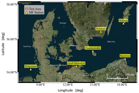 In this section, the performance of the system will be demonstrated mainly in terms of the horizontal positioning accuracy for the daytime scenario, with a negligible impact of the AGDF, and for the nighttime one with the presence of sky-waves. In February 2021, the DLR, with the support of the partners involved in the R-Mode Baltic project, performed a measurement campaign in the southern Baltic Sea on board the vessel Deneb that was provided by the BSH. The test area is located near Rostock and is visible in Figure 6 as a red rectangle. During the measurement campaign, only six out of the eight available R-Mode transmitters were operational, namely Groß Mohrdorf, Rozewie, Hammerodde, Helgoland, Holmsjö and Hoburg. They are visible as yellow triangles in Figure 6.