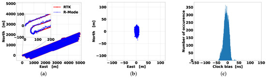 Daytime results. (a) Reference RTK (red circles) and R-Mode (blue crosses) tracks. (b) Scatterplot of the R-Mode positioning error in east and north. (c) Histogram of the estimated receiver clock bias.