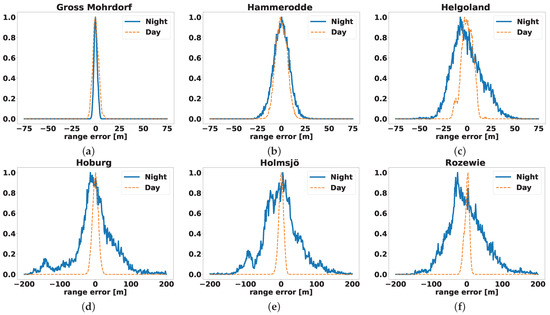 Normalized range error distribution for the CW1 signal. Solid blue line represents night-time data, while orange dashed line represents daytime data. (a) Groß Mohrdorf. (b) Hammerodde. (c) Helgoland. (d) Hoburg. (e) Holmsjö. (f) Rozewie.