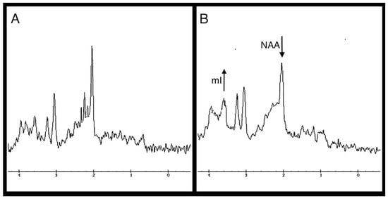 Exemplary 1HMRS spectra obtained from volumes of interest in the brains of (A) a healthy control and (B) a soldier.