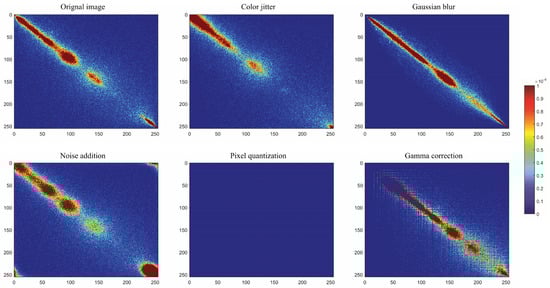 Normalized co-occurrences (shown as heatmaps) of two horizontally neighboring pixels in the green channel of the six images in Figure 2. In each sub-figure, the horizontal and vertical axes represent two pixels’ values (between 0 and 255). The color map used to represent normalized co-occurrence values in the six sub-figures is given at the rightmost of the figure. Zoom-in is recommended to well observe the red dots in the sub-figure of the pixel quantization operation.