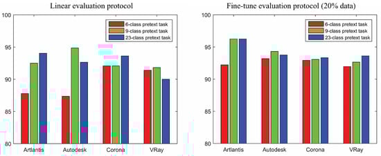 Experiments were conducted to study the impact of the pretext task design in our method. As presented in Section 3.2, we adopted a pretext task of 9-class classification of NIs and their modified versions, obtained by applying eight different manipulations. Here we compared with two other versions of pretext task, respectively, with 6 classes and 23 classes. In the version with 6 classes, we removed from the 9-class version the three manipulations of histogram equalization, pixel value quantization and Gamma correction. To get the version with 23 classes, we expanded the 9-class version with more variants for some manipulations. For example, in the 23-class version the Gamma correction manipulation had two ranges for the correction factor, i.e., between 0 and 1 (resulting in a brighter image after correction) and between 1 and 2 (resulting in a darker image). For the noise addition manipulation, we also considered the three variants with added noise only in one of the three color channels. Our purpose was to have a first and rough idea about the impact of the number of manipulations and their subdivisions with more parameters/settings on the performance of the main task of CG forensics. We tested the performance of these three pretext tasks (i.e., 6-class, 9-class and 23-class versions) under the linear and the fine-tuning (on training set) evaluation protocols. The performance comparisons are illustrated in Figure 5. We can observe that, in general, the 9-class version had consistently better performance than the 6-class version (except on Corona under the linear evaluation protocol where the performance was equal), while the 23-class version did not clearly perform better than the 9-class version and, sometimes, the performance of 23-class pretext task could be lower than that of the 9-class task (e.g., on Autodesk and VRay under the linear evaluation protocol). One possible explanation was that, in order to get a better CG forensics performance, the diversity of considered manipulation operations (i.e., the difference between the 9-class and 6-class versions), would be more important than the subdivision of manipulations with different parameters/settings (i.e., the difference between the 23-class and 9-class versions). The observations gained from this set of experiments would be useful for our future work on further experimental studies in this direction, as well as on the design of more appropriate pretext tasks for image forensics applications. For instance, and as mentioned above, it appears that increasing the diversity and types of manipulation operations would be more favorable than subdividing one manipulation into several with different intensities. In light of this observation, our proposed self-supervised pretext task could be further improved by seeking and including more kinds of diverse manipulation operations, or even by attempting to automatically derive the “optimal” set of manipulations (e.g., with inspiration gained from the method proposed in []).