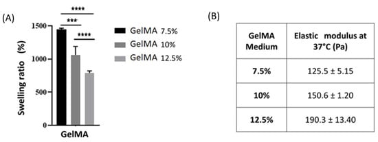 The three GelMA formulations were characterized by performing swelling and rheological analyses that provided useful information for 3D printing. Swelling ability is crucial to test hydrogels’ ability to absorb/hold large amounts of fluids. As shown from the experimental data (Figure 1A), the swelling degree increases significantly, raising GelMA’s concentration in solution from 7.5% GelMA to 12.5 % GelMA. It is important to note that the differences in swelling ratio are statistically significant. This behavior was expected and can be related to the lower hydrogel concentration in solution, which raises network expansion and, thus, the water absorption. Moreover, the rheological characterization performed in terms of frequency sweeps attested a measurement of GelMA samples elastic modulus at 37 °C (Figure 1B).