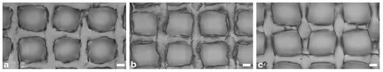 Bright field microscopy images of 3D scaffolds printed with different ink formulations, using a 200 µm needle: (a) GelMA 7.5%; (b) GelMA 10%; (c) GelMA 12.5%. Scale bar: 200 µm.