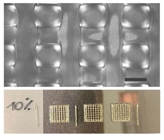 Three-dimensional printed scaffold in GelMA 10% ink formulation using a 400 µm needle: bright field microscopy image (upper panel; scale bar: 500 µm) and macroscopic picture (lower panel).