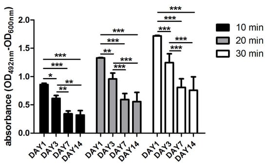 The quantification of LDH activity confirmed the cell viability results. In Figure 6, the histogram reports the values of LDH showing that it was higher on Day 1 and Day 3 compared to Day 7 and Day 14.