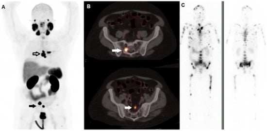 A 59-year-old man affected by prostate cancer, diagnosed in 2016 and submitted to prostatectomy (Gleason score 4 + 5, ISUP 5, pT3b pN1), subsequently treated with adjuvant androgen deprivation therapy. After 2 years, progressively increasing values of PSA were registered, and the patient underwent 2nd generation anti-androgen therapy with abiraterone and, due to progressive skeletal disease, chemotherapy with taxanes. (A) Whole Body 68Ga-PSMA-11 PET/CT demonstrated highly increased tracer incorporation within metastases in the thorax (black bordered arrow) and pelvis (black arrow). (B) Fused PET/CT axial images well depicted PSMA-avid lesions in sacrum (upper row, white arrow) and in a pelvic node (lower row, white arrow). Two months later, he underwent radioligand therapy with 177Lu-PSMA-617; PSMA PET/CT was not repeated due to the shortage of tracer’s availability. (C) Whole planar images (left side; anterior view, right side: posterior view) carried out by scintigraphy on 177Lu’s photopeaks after the 1st cycle of 177Lu-PSMA-617 showed multiple sites of tracer incorporation with a much more extensive skeletal metastatization than that revealed by PET/CT. This discrepancy might be explained by the too long interval of time occurred between the diagnostic phase and the therapeutic procedure in a subject with rapidly progressive disease.