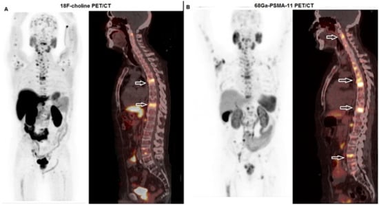 A 71-year-old man affected by prostate cancer, diagnosed in 2009 and submitted to prostatectomy (Gleason score 4 + 3, ISUP 3, pT2 pN0). After 8 years, progressively increasing values of PSA were registered, and the patient underwent a sequence of therapeutic regimens (antiandrogen deprivation therapy, 2nd generation antiandrogen therapy with enzalutamide, chemotherapy with taxanes). In 2022, due to progressive disease at a skeletal level, he was submitted to PET/CT with 18F-choline and 68Ga-PSMA-11 before enrollment for 223Ra-therapy. (A) Whole body (left side) and fused sagittal 18F-choline PET/CT (right side) demonstrated highly increased tracer incorporation in the thoracic spine (white bordered arrows). (B) Whole body (left side) and fused sagittal 68Ga-PSMA-11-PET/CT (right side) depicted multiple PSMA-avid lesions in the cervical, thorax and lumbar spine (white arrows). Note that the extension of skeletal involvement shown by 68Ga-PSMA PET/CT is much more relevant with respect to that demonstrated by 18F-choline.