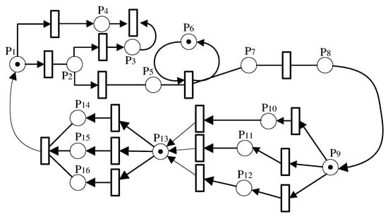 The division of the above three types for TE conducts to the integration of twin body data processing, and facilitates the design of simulation behaviors in the digital twin platform according to the digital twin representation methods of different TEs. In order to enhance virtual and reality interaction performace, our digital twin framework integrates SPN and evolution rules to improve better generalization on anomaly detection task. The SPN is defined as a seven-tuple . Based on the recursive combination of elements such as places and transitions, a logical network model of virtual-real interaction is constructed, as shown in Figure 2. The meanings of all places and transitions in the logical Petri net model are shown in Table 3.