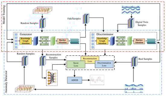 To achieve anomaly detection of multivariate time series data, we designed a multi-level crossover GAN network (MTAD-GAN), as shown in Figure 3. During the MTAD-GAN model training phase, we input random noise with the same dimension as the training sample into the knowledge graph attention and Hawkes attention long short-term memory (KH-LSTM) to obtain the generated sample. Then the generated samples and real samples are simultaneously transmitted to the discriminator for iterative training until the network reaches Nash equilibrium. In the anomaly detection phase, the test samples are mapped to the random latent space, and the reconstruction samples are generated through iterative training by calculating the reconstruction loss. In order to strengthen the feature difference between normal samples and abnormal samples, a scoring network is introduced here to calculate the score loss of the reconstructed samples. Combining the Gaussian joint distribution, the adaptive dynamic Gaussian score (ADGS) is constructed by fusing the scoring loss, reconstruction loss and discrimination loss to detect and judge the anomaly of the data.