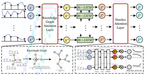 In the anomaly detection task, the knowledge graph attention module is introduced to enhance the spatial correlation of features. We incorporated the temporal Hawkes attention layer into the LSTM to suppress interference from unrelated features, as shown in Figure 4. The knowledge graph attention module is used to spatially weight the original input sequence . Based on the hidden layer space state of LSTM, combined with temporal hawked attention, the temporal correlation characteristics of the input signal are enhanced and obtain the spatiotemporal feature sequence .
