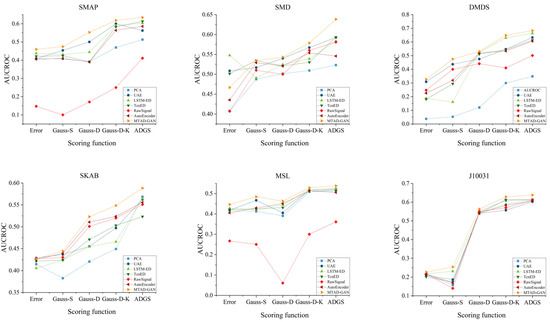 Figure 6 shows the performance comparison of this method with PCA, RawSignal, UAE, LSTM-ED, AE and TcnED on SMAP, SMD, DAMADICS, SKAB, MSL and J10031 datasets based on different scoring functions. The experimental results show that the choice of detection model and scoring function has different effects on anomaly detection. Compared with other algorithms, the performance of MTAD-GAN is improved by 0.01∼0.4, while ADGS integrates multiple loss items to better identify abnormal situations. Compared with other scoring functions, the model performance is improved by 0.16∼0.4.