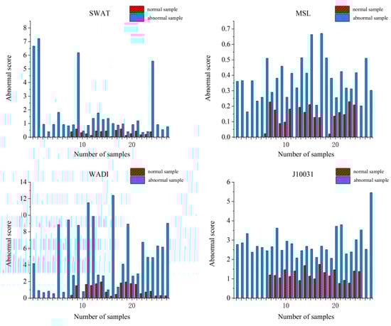 To verify the model’s ability for detecting abnormal data, the SWAT, WADI, MSL and J10031 datasets are evaluated for abnormal scores. It can be seen from Figure 7 that there is a significant difference between normal and abnormal distribution in the scores, and the abnormal score is higher than the normal score with the average score difference between 0.01 and 9.21, which proves that the MTAD-GAN model can reflect the characteristic distribution of data and give more accurate abnormal scores.