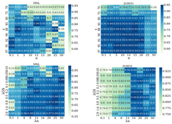 We introduce a scoring network to analyze the sensitivity of different weight parameters of MTAD-GAN and optimize the model. The parameters in Equation (22) are divided into two groups, namely and . Figure 8 shows the AUCROC indexes used to measure the sensitivity of the two groups of parameters on the MSL and J10031 data sets respectively. It can be seen that different data sets have different sensitivity to parameters. On MSL dataset, when and , the correlation of parameter is strong. On the J10031 dataset, when and , the model performance is relatively stable.