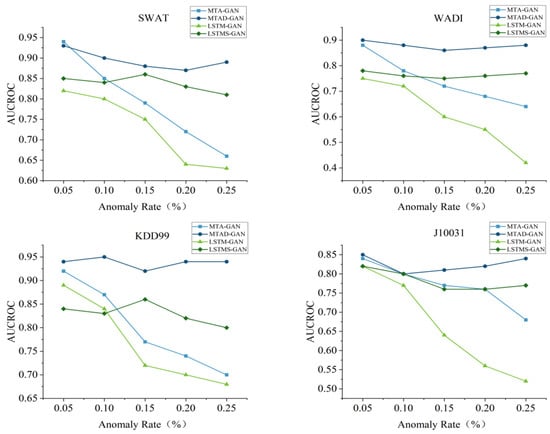 To verify the effectiveness of the loss function used in this paper, the scoring loss network is removed from MTAD-GAN and marked as MTA-GAN, and the scoring loss (i.e., LSTMS-GAN) is introduced into LSTM-GAN for retraining. The abnormal samples are randomly deleted from KDD99, SWAT, WADI and J10031 datasets, and the abnormal rates are adjusted to 5%, 10%, 15%, 20% and 25% respectively. The test results are shown in Figure 9. It can be seen that the performances of LSTMS-GAN and MTAD-GAN are relatively stable when all loss functions are used; on the other hand, the AUCROC performance of MTA-GAN and LSTM-GAN has decreased to varying degrees on the four datasets with an average performance decrease of 15∼87.5%.