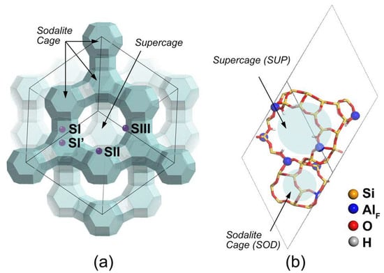 (a) Typical topology of faujasite zeolite and location of extra-framework aluminum active sites (S); (b) rhombohedral faujasite studied by []. Reproduced from []. Copyright 2015 ACS.