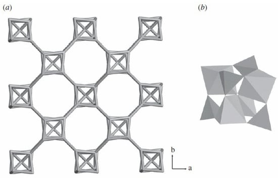 (a) Eight-ring channels in FeAPO-CJ66 structure along the [001] direction; (b) D4R unit from “Fe(Al)4P4.” Reproduced from []. Copyright 2012 The Royal Society.