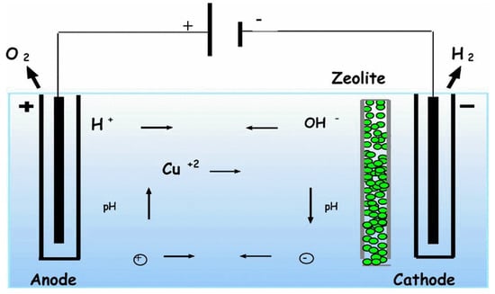 Ion Cu2+ migration under electric field toward electrodes and zeolite slice to trap them. Reproduced from []. Copyright 2006 Elsevier.