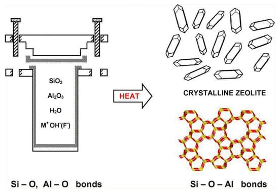 Finally, Abdullahi et al. [] (p. 18) observed in their studies that the temperature and time of synthesis must be within a defined range, defining the type of zeolite to be formed and maintaining a direct relationship between structure crystallization, crystallization time, and particle size. Other studies have shown that gradually, the amorphous material is replaced by the crystalline zeolitic material []. Studies have been carried out on the effect of temperature varying between 120 and 190 °C for 48 h, and the time has varied from 24 to 96 h []. The increase in temperature enabled amorphous crystalline–quartz material transition []. While studies have reported that an increase in reaction time at a temperature of 150 °C leads to the formation of crystalline zeolitic material, the increase in time at 120 °C leads to the transformation of quartz to crystalline material [] (p. 18). Figure 10 shows a general scheme of hydrothermal synthesis.