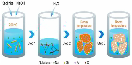 In another study led by Zhou et al. [], it was observed that in the process, the precursor material is initially mixed with a salt or a eutectic mixture of salts, such as NaCl/KCl. The temperature then increases to a level above the melting temperature of the salts, allowing for a flow and diffusivity of the salt, forming a molten stream, thus leading to the dispersion and rearrangement of precursor components in the saline environment. After this process, with the increase in temperature, a nucleation process starts to occur followed by a growth step depending on the chemical nature of the salts, the amount of salt present, the temperature and the reaction time. In work by Miao et al. [] (p. 20), it is reported that applications of the method may involve helping to dissolve minerals such as vanadium slag and chromite minerals at ambient pressure. In this context, medium conditions such as high alkalinity and high boiling point contribute to good fluidity of the reaction medium. Mass transfer and product conversion increase as temperature decreases. The use of so-called molten salt reactors was reported by Riley and colleagues, who made use of this method to aid in energy generation, being another application in addition to the synthesis of zeolitic materials []. Regarding applications, in the work by Yang et al. [] the use of a sub-molten salt method for the depolymerization of aluminosilicate structures in silicon and aluminum species in mesoscale structures stands out. Figure 11 shows the steps of this synthesis method.