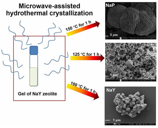 Other developments in the method lie in obtaining zeolite A after 12 min of synthesis, studying the effect of digestion on the formation of this structure []. Synthesis of faujasite zeolites is capable of being completed in a short period of time at temperatures close to 150 °C. Faujasites with high Si content can be obtained by assisting the use of microwaves with optimal characteristics for use in catalysis, such as high selectivity, activity, and stability, at a reduced reaction time from 48 h to 30 min compared to the conventional process []. In obtaining the Y type, the advantages of the method lie in maintaining the characteristics of those structures obtained industrially. The evolution of the products obtained as temperature advances can be amorphous phase, zeolite Y, and zeolite P2. Moreover, among the phenomena that can explain the synthesis process in this method, the interaction that water molecules promote with radiation and dispersion of the aluminosilicate gel in the medium should be noted [,].