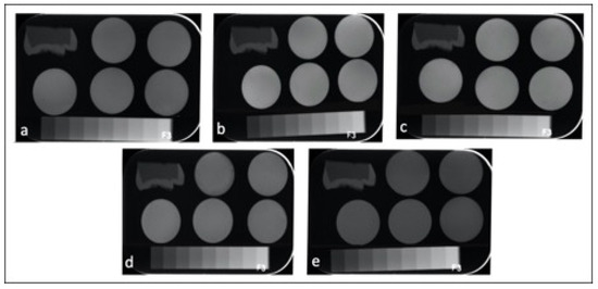 Radiographic images of the enamel, dentin, aluminum stepwedge and universal CRs: (a) GA; (b) CD; (c) NS; (d) F; (e) EA.