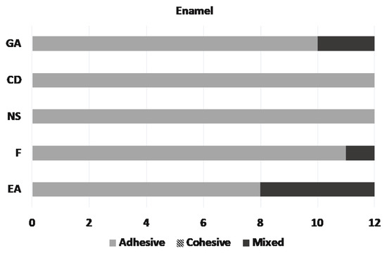 Microscopic assessment of the fractured surfaces and failure types of each CR for enamel and dentin are presented in Figure 2 and Figure 3. There were no significant differences among different CRs and the three types of failures (p = 0.079 and 0.541, respectively). The most common type of failure encountered was adhesive, followed by mixed failure. Significantly more adhesive failures were seen in enamel compared with dentin (p < 0.001). No cohesive failure was observed in any of the groups for both enamel and dentin specimens (Figure 4).