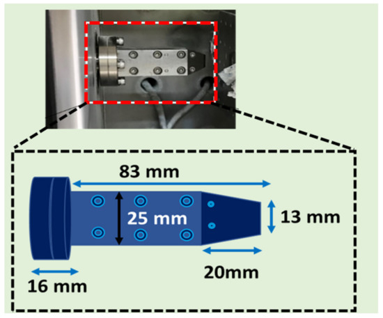 The details of the AD equipment used are reported in our previous study [36]. In the AD process, high purity nitrogen gas (99%) was used to carry and accelerate the ZnO powder onto the FTO substrate. The flow rate of carrier gas was fixed at 30 L/min. The pressure of the AD chamber was maintained at 20 Pa during the AD process. The deposition time per cycle was 4 min and 15 s. The area of the deposited film was 10 × 20 mm2. In order to investigate the effect of the number of deposition cycles, ZnO films were aerosol-deposition for one, two, and three cycles. The ZnO films deposited with different cycles were labelled as AZ-I, AZ-II and AZ-III, respectively. The geometry of the nozzle used in AD is displayed in Figure 1. All other deposition parameters were kept constant as listed in Table 2.
