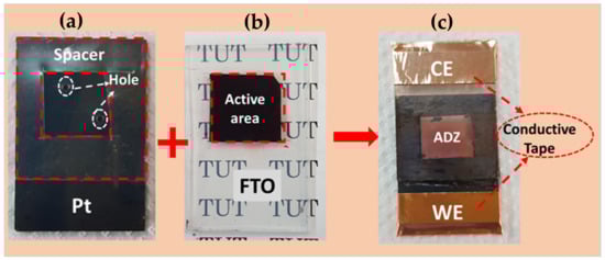 Photographs showing the (a) Pt counter electrode (CE), (b) N719-sensitized working electrode (WE) and (c) fabricated sandwich-type ZnO film based DSSCs.