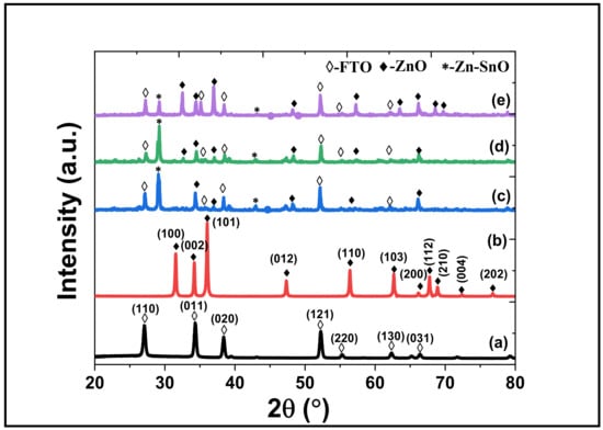 X-ray diffraction pattern of (a) FTO, (b) raw ZnO powder, (c) AZ-I, (d) AZ-II and (e) AZ-III films.