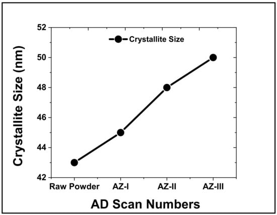 The average crystallite size of ZnO powder was 43 nm. The average crystal size of ZnO films slightly increased to 45, 48 and 50 nm for AZ-I, AZ-II and AZ-III films, respectively as shown in Figure 4. The increment in crystallite size suggests that consolidation and recrystallization occurred during the AD process. The kinetic energy of ZnO powder could generate localized heating and energy conversion resulting in the growth of ZnO crystallites through densification and particle bonding when the powder impinges on the FTO glass substrate [38]. The continuous supply of kinetic energy with an increased number of cycles (three deposition cycles) could cause formation of higher crystallite size due to fusion of fine particle fragments.