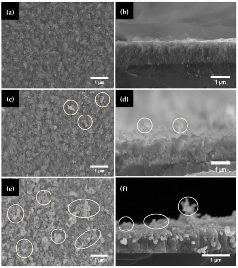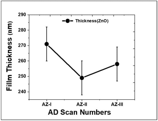 The effects of deposition cycles on the morphology and thickness of ZnO films were characterized using FESEM and the results are shown in Figure 5. From the SEM image shown in Figure 5a, a rather smooth, compact, and dense surface is observed with some remnant particles on the surface. The cross-sectional view in Figure 5b shows that the deposited ZnO film has a rather uniform thickness with an average of 271 ± 44 nm (n = 10). In the initial stage of AD, formation of a stable anchor layer at the substrate interface is important prior to subsequent deposition of dense film. During the anchor layer formation, a sufficient amount of independent particles plays a vital role in forming the initial anchoring layer [39]. More remnant agglomerated particles were also observed on the surface of AZ-II as highlighted in circles in Figure 5c. The thickness of ZnO film obtained was slightly reduced to 249 ± 51 nm as shown in Figure 5d. Further increase in the deposition cycle to three cycles led to the formation of large particle agglomerates as shown in Figure 5e. The surface appearance of the AZ-III films was less dense, with rough surfaces observed. The thickness of ZnO film was 258 ± 51 nm as shown in Figure 5f. From the cross-sectional SEM images shown in Figure 5f, the thickness was less uniform as compared to AZ-I and AZ-II. It is thought that the abrasion of the deposited ZnO films by the subsequent deposition cycle caused the reduction in thickness. During the aerosolization process in the rotating aerosol chamber, agglomeration of the ZnO particles occurred forming submicron-sized agglomerates due to Van der Waals interaction. The injection of agglomerated ZnO particles could cause film abrasion. Therefore, the thickness of the AZ films decreased during the second deposition cycle and increased slightly after the third deposition cycle as shown in Figure 6. Nevertheless, the slight increase in thickness of AZ-III could be due to process variation, or the formation of many agglomerated particles that are observed on the surface of AZ-III as shown in Figure 5e,f.