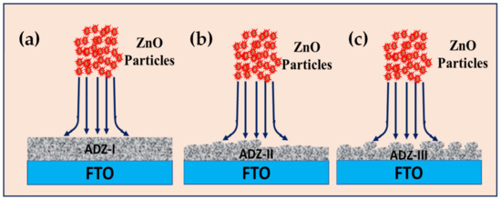 Schematic representing the formation of ZnO films using the AD method under different deposition cycles (a) AZ-I, (b) AZ-II, and (c) AZ-III.