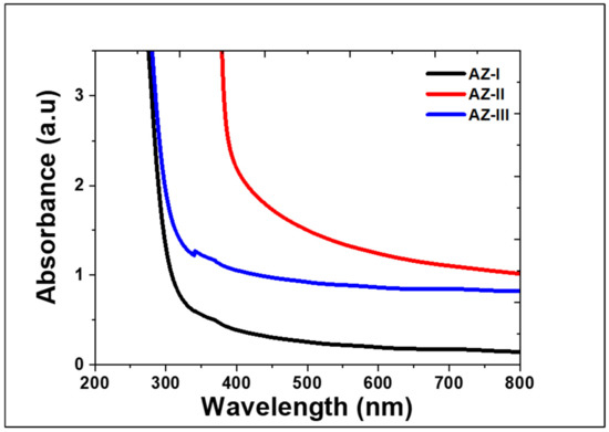 Figure 8 shows the UV-Vis results of the ZnO films obtained using different deposition cycles. The adsorption spectrum was recorded in the wavelength range 200–800 nm. All the ZnO films exhibited UV absorbance at wavelengths of less than 400 nm. The AZ-I film exhibited an absorption edge at 325 nm. As for the AZ-II and AZ-III, the UV absorbance edge was at 432 nm and 339 nm, respectively. The result indicates that the optical properties of the ZnO films change with the number of deposition cycles. During AD process, fragmentation of the raw particles could cause a reduction in the crystallites (1/10th of the original raw material particles) [29]. Therefore, as the size of the ZnO used in this study was approximately 100 nm, it is thought that particle fragments generated could have resulted in different optical properties due to the abovementioned phenomenon.