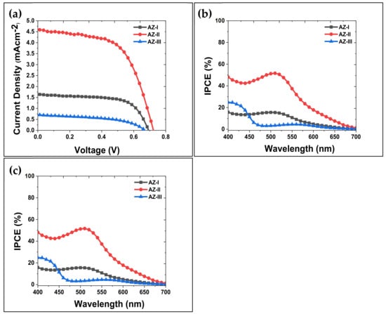 (a) J-V curves, (b) photoconversion efficiency (PCE) and (c) IPCE obtained using the fabricated AZ-DSSCs.