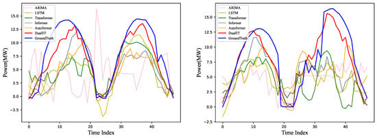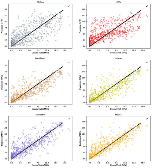 The prediction results of different models are presented in Figure 4 and Figure 5. It obviously shows that the number of deviation points predicted by the statistical model ARIMA is much larger than those predicted by other DNN-based models, which indicates that ARIMA is unsuitable for short-term prediction up to several hours, especially for the nonstationary PV power series. As shown in Figure 5, the LSTM model has a more scattered distribution of points than the transformer-based models, which indicates the significance of transformer architecture for sequence modeling. It can also be seen that the proposed DualET presents the fittest curves in Figure 4 and the narrowest band in Figure 5 compared with other baselines, which shows the advantages of PV power prediction.