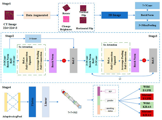 Stage1 was the input layer, which was responsible for processing and loading images. To alleviate the overfitting problem of the model caused by insufficient data, the data augmentation technique was used to expand the training dataset. Each slice generated four enhanced images by performing an image rotation, a vertical flip, a horizontal flip, and by changing the image brightness for each 2D nodule slice. The input images were processed from EGFR and KRAS datasets. Then, all images were uniformly scaled to 224 × 224 to accommodate subsequent model processing. Immediately after the data augmentation, the input images were down sampled through a series of convolutional layers. These layers were a 7 × 7 convolutional layer, a batch normalization layer, and a 3 × 3 maximum pooling layer. They were used to retain as much original information about the images as possible.