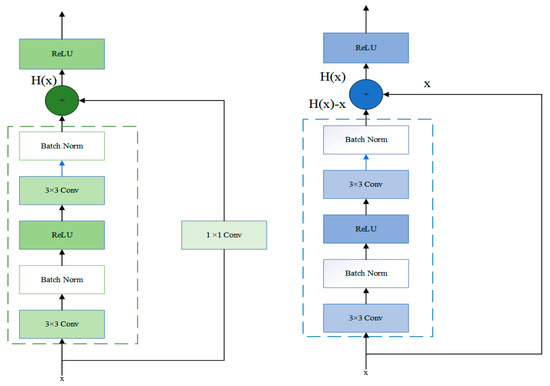 If x is passed directly to the output H(x), then the target to be learned by this network model is the residual mapping. As shown in Figure 2, this structure represented the residual learning unit that consisted of convolutional layers and shortcuts. The input x is passed to the output of the residual learning unit through the shortcuts, thus allowing it to learn the residuals directly. Precisely, the residual network consists of a series of residual blocks. The mathematical expression of the residual blocks takes the form of Equation (2):