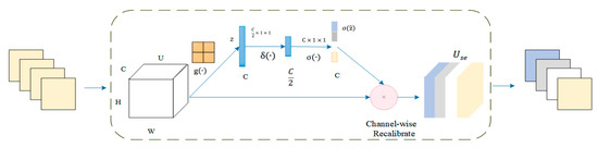 The squeeze activation module includes a global average pooling layer and two fully connected layers. The input feature map is U = [u1,u2, …, uc]. The value U performs a global average pooling operation for space compression. The process is defined as . Then, the vector z is obtained. The value of each channel of z is obtained by the calculation method shown in Equation (10).. H is the height of the feature map; W is the width of the feature map; C is the number of channels; and is the spatial coordinate in the feature map. The z is input into the fully connected layer. The degree of importance of the ith channel feature is calculated using the activation function and the normalization layer function in turn. The final standard sampling process was completed by recalibrating the channels. In summary, the SE module is implemented in Equation (11). In essence, the feature image was introduced a dynamic prior to the input image by the squeeze and excitation unit.