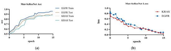 Mut-SeResNet: (a) the accuracy of Mut-ResNet in predicting EGFR and KRAS; (b) the loss of Mut-ResNet in predicting EGFR and KRAS genes.