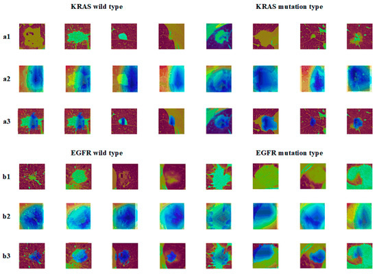 In Figure 8, the a2 images showed the graph of the EGFR gene visualization results, b2 showed the KRAS gene visualization results, and a3 and b3 were the superimposed heat map images and CT images, respectively. It can be seen from the graph that the model gave less weighted attention to the corresponding nodal regions of EGFR/KRAS when compared to the multitasking. The attention given to the EGFR gene was even more weighted. Consequently, the mutation prediction effect of the EGFR was better than that of the KRAS, which was related to the sensitivity of the EGFR to images.
