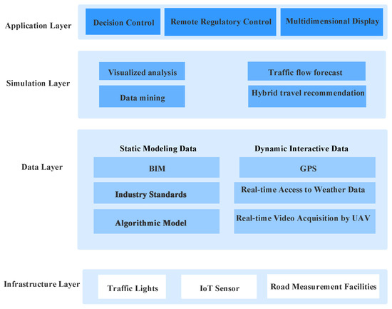 Digital twin technology supports ITS development [25]. From the perspective of module functional units, digital twinning technology based on ITS system can be divided into infrastructure layer, data layer, simulation layer, and application layer (Figure 2), simulation layer and application layer, corresponding to physical model, data model and simulation model respectively. Redelinghuys’ [5] six-layer framework is relatively complex and not suitable for the transportation network. In order to be more suitable for the practical application of traffic networks, we added the application layer and combined the multidimensional data into one layer to make it more concise and clear.
