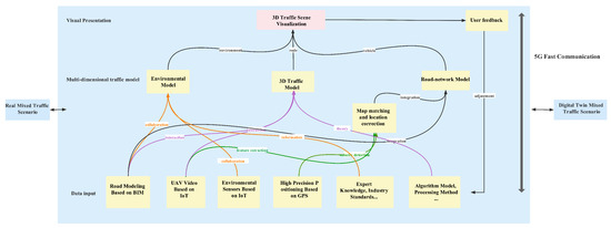 Digital twin is a large virtual data management system that uses three-dimensional (3D) modelling, Internet of Things (IoT) [1], Artificial Intelligence (AI) and other technologies to connect and manage physical cities and virtual cities in digital space. Grieves first proposed his concept in 2003 [2]. Researchers said that physical devices create and connect virtual units in space. This connection is stable and accurate, so it is called model image space. Grieves officially named it “Digital twin” in 2010 [3]. Grieves then proposed 3D models based on physical units, virtual entities and connections [4]. These models have become the most widely used models. With the increase in application requirements and the improvement of theoretical technology, the development of digital twin models also presents a new trend. In order to enable information exchange between simulation and physical twins, A.J.H. Redelinghuys et al. [5] proposed a six-layer structure of digital twins. F. Tao et al. extended the traditional “THREE-DIMENSIONAL” model in [6] and proposed a “FIVE-DIMENSIONAL” model based on the physical entity (PE), the virtual entity (VE), the services (Ss), the digital twin data (DD), and connection (CN), which meets the new requirements of digital twin applications. Unlike A.J.H. Redelinghuys, Tao also took into account the users in the system. Based on the five-dimensional model, Wu proposed a conceptual modelling method of digital twins, using the TRIZ function model to express the complex relationship between digital twins and their attributes [7]. Digital twin technology can help urban management and decision-making to coordinate and achieve intelligent, accurate and safe transportation [8].