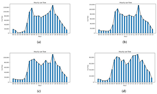 Distribution of temporal travel characteristics on weekdays and weekends. (a) Hourly car flow of Monday. (b) Hourly car flow of Thursday. (c) Hourly car flow of Saturday. (d) Hourly car flow of Sunday.