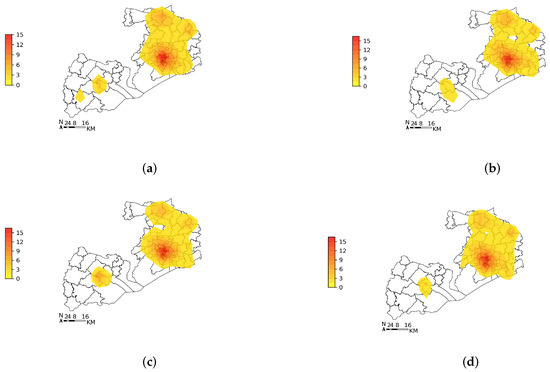 Heat map of spatial distribution of travel hotspots. (a) Hotspots of Monday. (b) Hotspots of Thursday. (c) Hotspots of Saturday. (d) Hotspots of Sunday.
