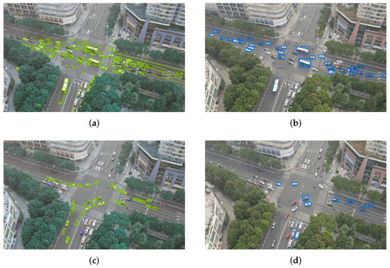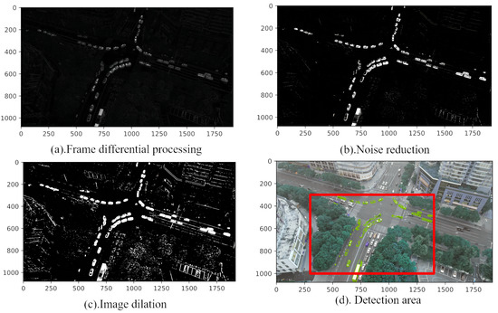 The main acquisition area of UAV video is the intersection, and the vehicles at the intersection move alternately. In order to avoid repeated detection, multi-frame difference processing is performed first. The difference operation is performed between the (n + 1)th frame and the nth frame image, and between the nth frame and the (n − 1)th frame image and the moving target is selected by the difference operation between the next frame and the selected frame, as shown in Figure 8a. In the figure, the white area is the moving target, and the frame difference is defined as: