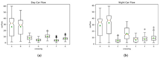 In this paper, we selected seven intersections in Wuxi commercial centre to mine the travel traffic flow from 8:00 to 9:00 in the morning and 17:30–18:30 in the evening. As shown in the box plot in Figure 9, the traffic flow variance between intersections A and B during the morning rush hour and intersections A, B, and D during the evening rush hour is large, so they are marked as key mining intersections.