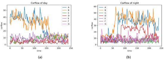 Based on the above analysis, the traffic flow data mining based on DFA is further carried out at key intersections. As can be seen in Figure 10a, intersection A and intersection B show obvious morning peak characteristics, and the traffic flow continues to show a congestion trend from 8:00 to 8:44, and then drops sharply from 8:45. As can be seen from Figure 10b, intersections A, B and D show an obvious evening peak trend, with a sharp increase in traffic flow from 17:45 and continued congestion thereafter.