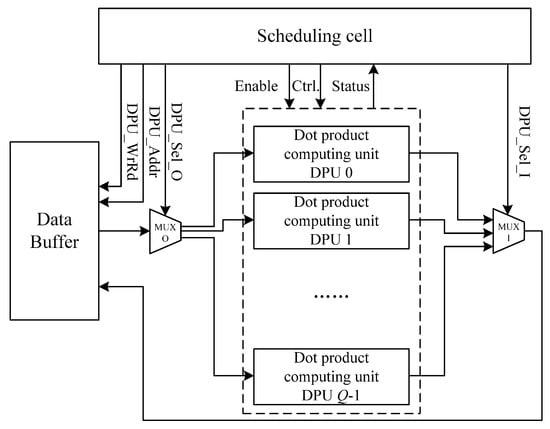 The hardware design block diagram of parallel dot product matrix calculation controlled by the mechanical arm is shown in Figure 2, including the scheduling computing unit, data cache, dot product computing unit, and gating MUX_O and MUX_I. Among them, the scheduling computing unit controls the data cache through the cache read and write control signal DPU_WrRd and cache address access signal DPU_Addr. According to the read and write needs, the read data sent to the gate MUX_O are sent to the dot product computing unit group as the optional communication signal DPU_Sel_O. The output result of the dot product unit group passes through the MUX_I and is sent to the data cache by DPU_Sel_I as the optional communication signal. The scheduling cell can enable and control its parameters according to the output state of the clicking cell group.