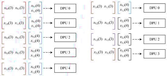 According to the calculation process in Figure 5, parallel tasks are assigned to the dot product computing unit DPU in Figure 2. Figure 6 depicts the example of the matrix multiplication dot product sample cell group task allocation, when the number of dot product parallel computing is 5. Figure 6 shows the distribution of each non-zero vector in each dot product computing unit during the multiplication of matrix X4×4 (3) and X4×4 (4). The first five vector dot products are allocated to five units, and the last four vector dot products are allocated to the first four vector dot products after the first calculation process is completed.